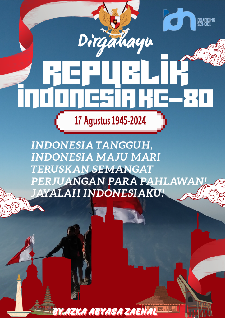 assalamualaikum warahmatulahi wabarakatu Hello everyone, I want to tell you about the basic design of the poster about the 80th dirgahayu of the Republic of Indonesia. There are many kinds in it, namely megamendung batik, the Indonesian flag, cities and traditional houses, and Monas and mount in background and logo idn boarding school. eagle and more. Maybe that’s all from me. Thank you for reading this message. wassalamualaikum warahmatulahi wabarakatu