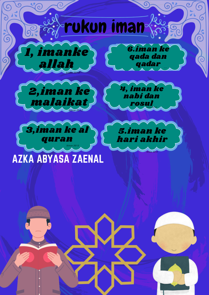 Hello everyone, here I want to tell you about Dinniyah lesson. about rukun iman OK, so I want to explain the details in my poster First, here are children and their father reading al quran secondly, there are border elements and details in the corners and in the bottom middle Thirdly, there is a blue background and there are purple and blue lines and finally there are readings that we must understand and comprehend