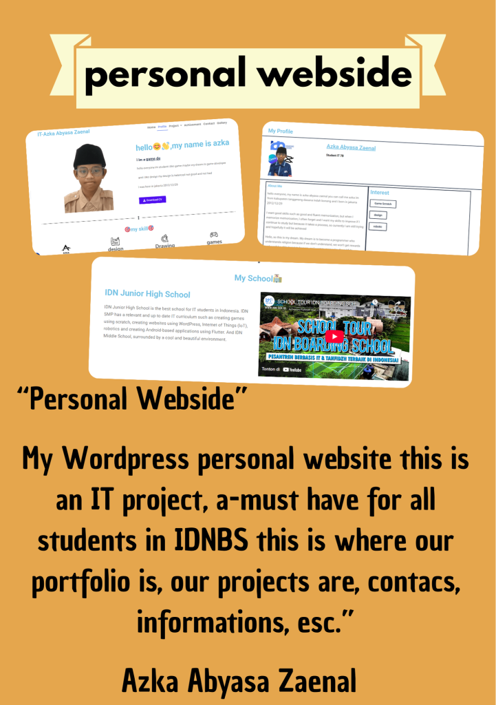 Because, in ninth grade / third-year, we’ll make a portfolio and a CV (curriculum vitae). Also, every time we finish a project, we upload it here, in our personal website. We also have other things here such as our achievements, contacts, gallery, information, etc. ok that all from me thank you for your attention wassalamualaikum warahmatulahi wabarakatu